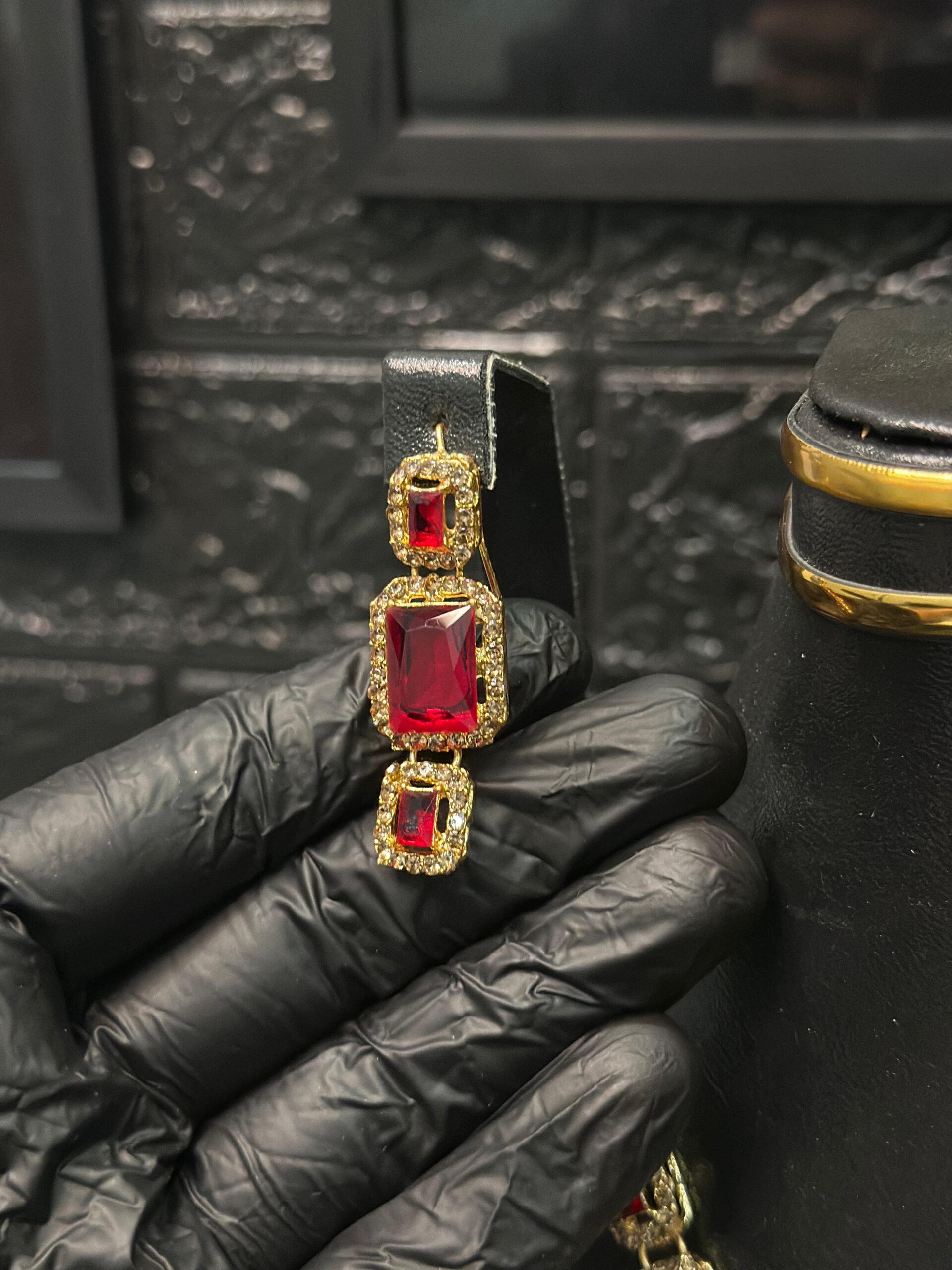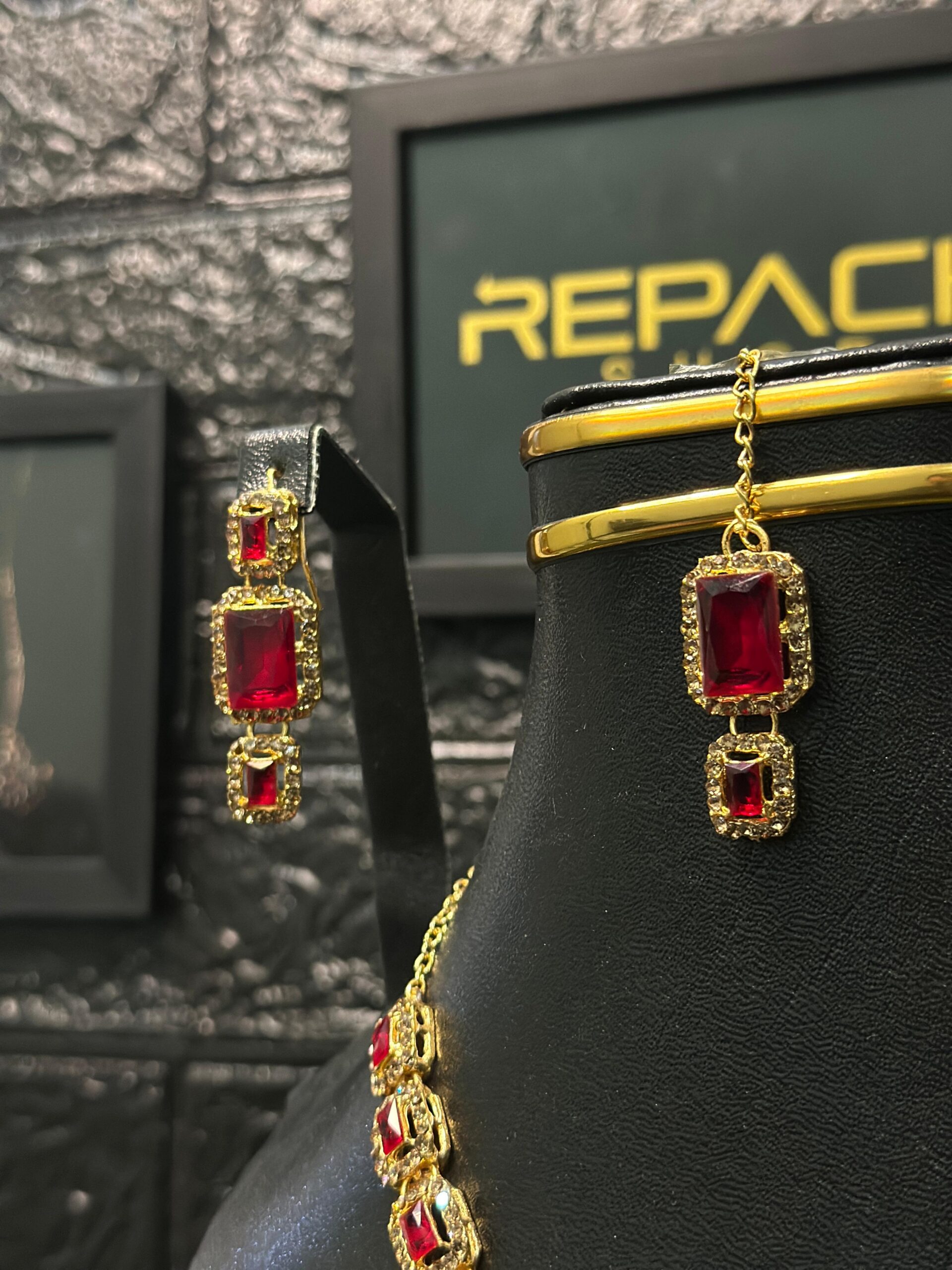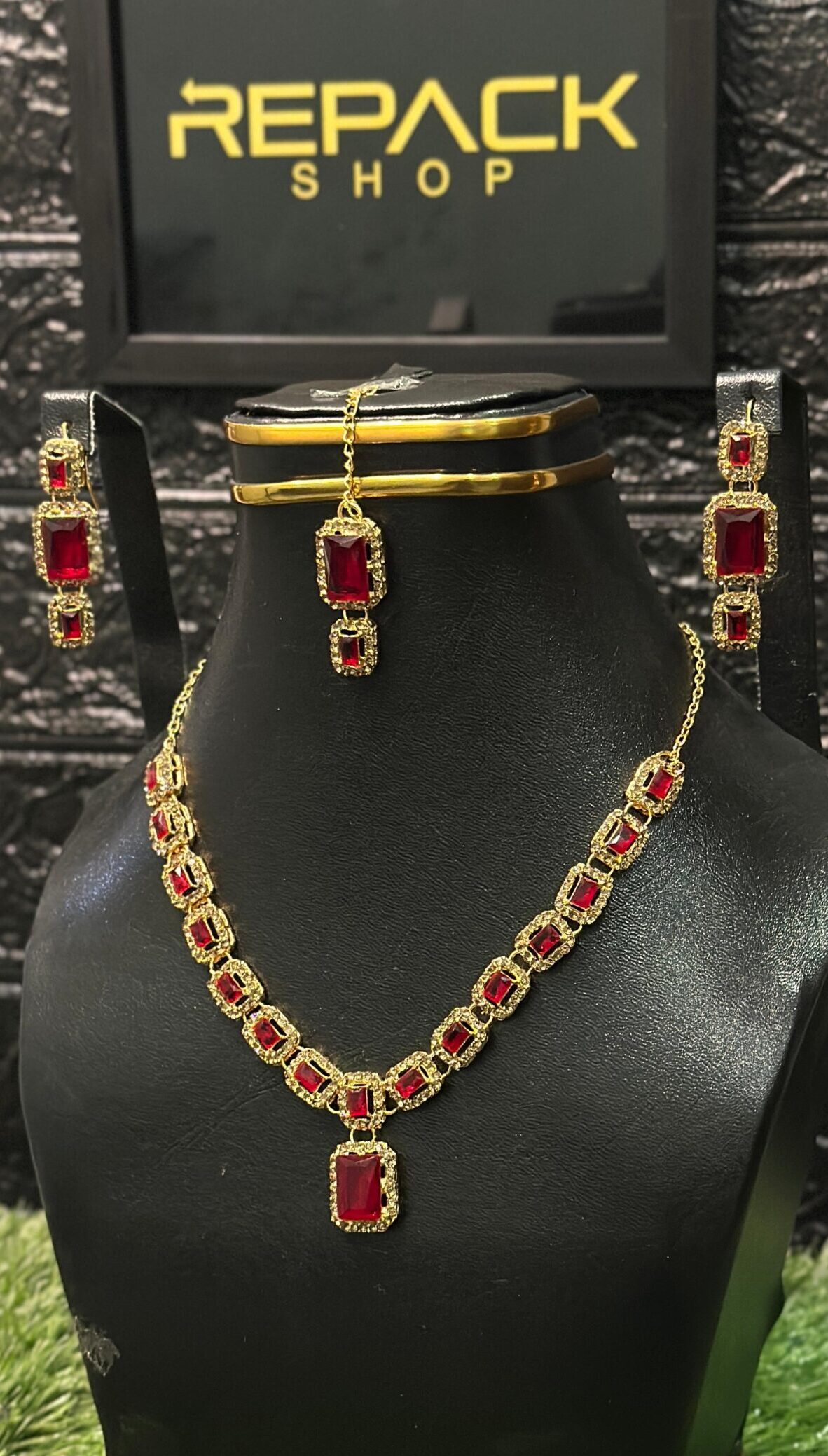Elevate your style with this stunning gold-plated jewelry set, featuring radiant deep-red stones framed in elegant detailing. The matching necklace, earrings, and tikka create a complete luxury look perfect for weddings, parties, and special occasions. Designed to shine with timeless beauty, this set adds a touch of royal charm to every outfit.
